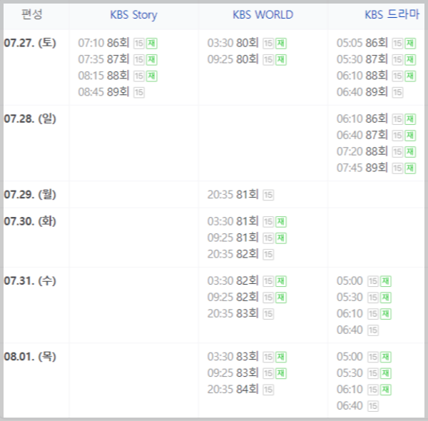 7월 26일 방영된 89회분의 가장 빠른 재방송은 KBS Story TV에서 7월 27일 오전 8시 45분에 방송합니다.